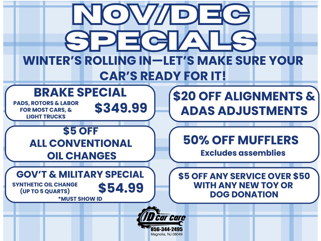 Our services include: Brake service, oil change, fully custom exhaust, ADAS calibrations, alignments, suspension, engine repair, AC service, and much more!